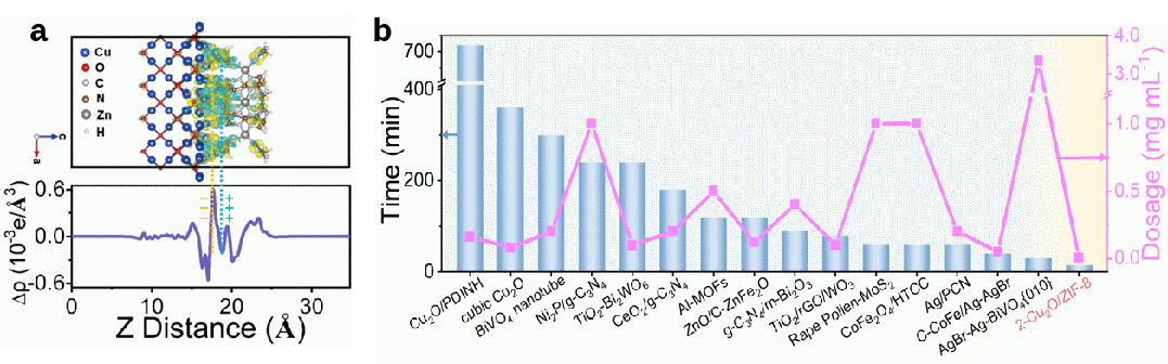 图1. Cu2O/ZIF-8异质结的界面电子分布(a)与光催化灭活病原体性能对比(b)
