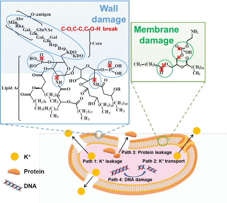 图2. 异质结光催化破坏病原体膜结构和DNA断链机制