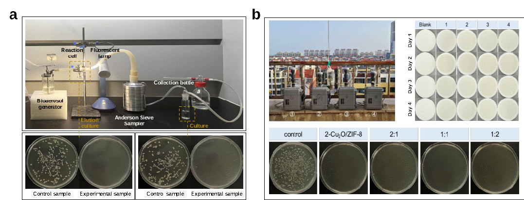 图4. 气相微反应器光催化灭活生物气溶胶实验(a)与大气颗粒物共存体系下的性能评估实验(b)