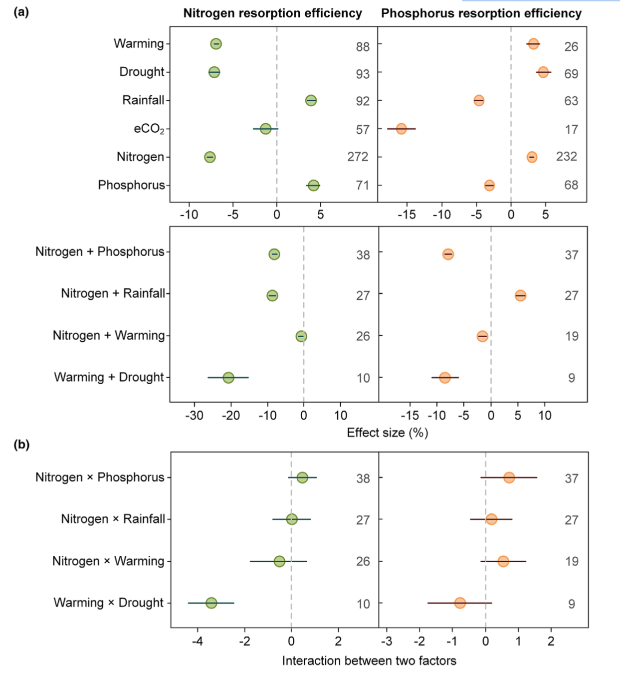 长期以来,学术界普遍认为氮循环与磷循环是紧密耦合的。然而,这一假设尚未在全球变化背景下得到严格验证,这限制了我们对氮磷循环的预测能力。关中平原国家站团队通过整合107篇已发表文献中的1341个数据点,对过去二十年来叶片氮磷回收效率(nitrogen and phosphorus resorption efficiency; NRE and PRE)对主要全球变化因子(包括气候变暖、干旱、降水增加、CO2浓度升高、氮肥施用和磷肥施用)的响应进行了整合分析。研究发现,植物氮磷回收对这些全球变化因子的响应存在显著差异,表明全球变化背景下植物氮磷循环发生了解耦(图1) 。NRE与PRE对单一全球变化因子的响应呈现显著分异:大部分全球变化因子导致NRE与PRE发生方向相反的改变,而CO2浓度升高虽使二者同向变化,但变化幅度存在显著差异。