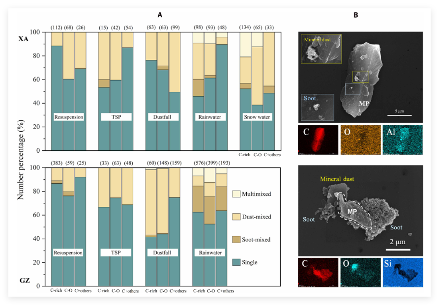 图2、城市大气环境样品中塑料颗粒的异质聚集. (A) 大气塑料粒子与黑碳和矿物尘粒子聚集体的相对含量;(B) 微/纳尺度异质聚集体的典型形貌