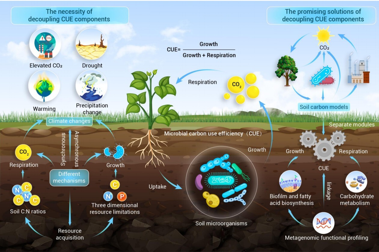 传统研究常将CUE视为整体参数,但其主要包含生长与呼吸两个过程,二者受不同机制驱动。对此,本文梳理了生长与呼吸在驱动机制上的差异。微生物生长主要受碳、氮、磷等养分的协同限制,取决于资源可用性;而呼吸速率更依赖于底物的化学性质,如碳氮比与结构复杂性。此外,在气候变化情境下,如增温、干旱或二氧化碳升高,生长与呼吸往往呈现同步或异步响应,掩盖了CUE的潜在驱动机制。因此,将CUE解耦为生长与呼吸两个组分,有助于揭示环境变化下土壤碳周转的微观机制。